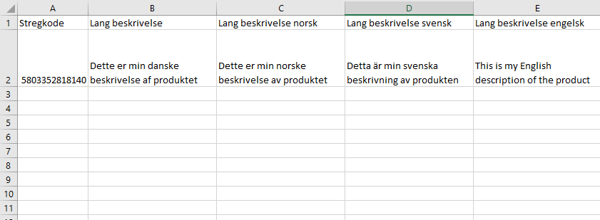 Lang beskrivelse Engelsk - Her angives Lang beskrivelse på engelsk, såfremt denne haves. Har i ikke en engelsk beskrivelse af produkterne efterlades kolonnen blank, men med overskriften "lang beskrivelse engelsk" - Har i allerede en tekst indlæst, forsvinder denne ikke, hvis feltet efterlades blankt.