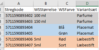 Her skal du oprette et variantsæt for farve og kun udfylde feltet WSFarve.