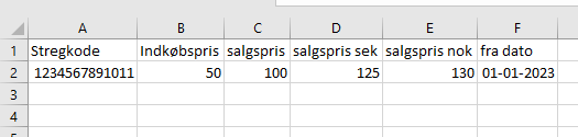 It is very important that a price increase is informed to your buyer at Magasin. Decide with your buyer when the price increase should occur. Once this is reconciled, fill in the file below and send back to us via. either your mail-setup or FTP.